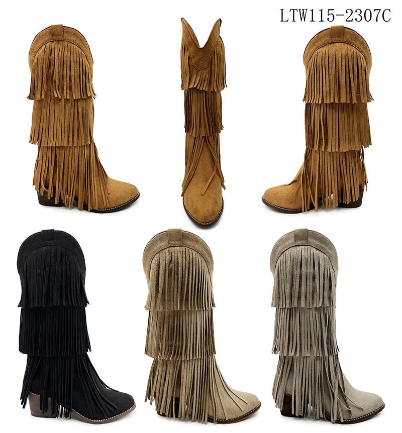 Fringe Decoration: Multiple rows or layers of fringes are the primary decorative elements, adorning the surface of the boot shafts. As the wearer walks, the fringes sway, adding a dynamic and lively touch to the overall look, which is highly visually appealing. The fringes are made from various materials, commonly leather and faux suede. Leather fringes exude a cool and tough vibe, while faux suede fringes tend to be softer and more laid – back.