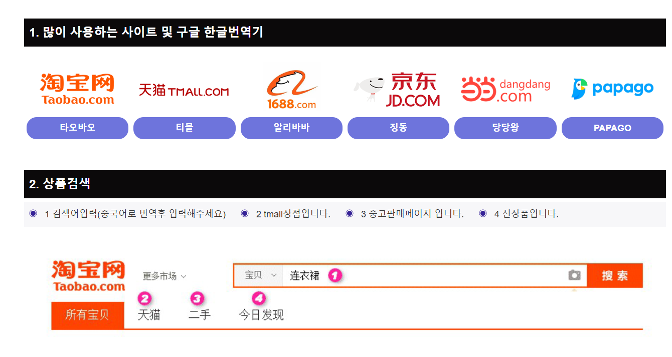 The Taobao usage knowledge page introduces commonly used Chinese shopping platforms, including Taobao, Tmall, Alibaba, JD, and other sites. It also mentions translation tools that can help users convert Korean search terms into Chinese before searching for products. This is important because searching with the right Chinese keyword can improve product matching and help buyers find more accurate results.